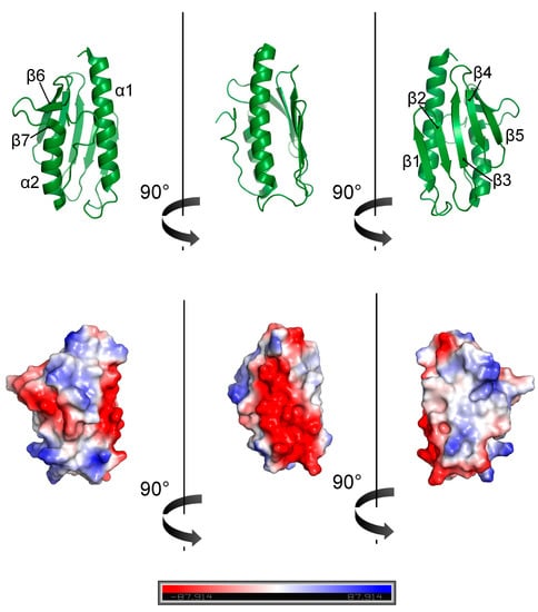 Several solutions and crystal structures have been deposited in PDB for the bacterial and eukaryotic orthologues of frataxin [,,,,,,,]. The structures of yeast and human and bacterial frataxin orthologs are similar and consist of two regions: a compact globular C-terminal domain [] and an intrinsically unfolded N-terminal tail (residues 81–92 in human frataxin). Overall, the domain presents a planar α−β sandwich structure motif (α1β1β2β3β4β5β6(β7)α2) with two terminal α-helices supported by a platform provided by five antiparallel β-strands and a sixth (and in human frataxin also a seventh) β-strand that intersects the planes (Figure 2, top).