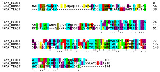 Multiple alignment of the three frataxin orthologues obtained with Clustal Omega and color-coded to emphasize the conserved sequence.