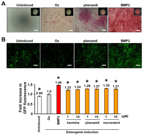Verification of ALP and GFP expression of Col-1a1GFP-MC3T3E1 cells. Pre-osteoblastic Col1a1GFP-MC3T3-E1 cells, stably transfected with the GFP reporter gene driven by a fragment of rat type I collagen promoter, were cultured in 96-well culture plates for 14 days in the growth medium (Uninduced) or osteogenic induction medium (Os) in the presence or absence of 1 or 10 µM of osteogenic inducible compounds (harmine, phenamil, and resveratrol) or BMP2 (100 ng/mL). (A) Col-1a1GFP-MC3T3-E1 cells cultured under Os conditions with phenamil (1 µM) or BMP2 strongly expressed ALP on day 14. Representative image from three independent experiments are shown. Bars: 100 µm. (B) GFP fluorescence of Col-1a1GFP-MC3T3-E1 cell culture under each condition was measured on day 7. Representative fluorescence images from three independent experiments are shown. Values shown are means ± standard errors of the means (n-fold increase) in the GFP fluorescence intensity compared to that under Os conditions from three independent experiments (n = 3). Significant differences (* p < 0.01: ANOVA with Dunnett’s correction for multiple comparisons) were evaluated with respect to the Os condition values.