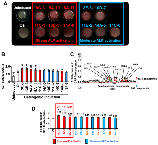 Library screening of Lopack1280 using the cell-based double-screening method. The Lopack1280 library compounds in a 96-well format were added to Col1a1GFP-MC3T3-E1 cells in osteogenic induction medium (Os) at 10 µM concentration. (A) ALP staining on day 14 showed that six compounds (9C-3, 9A-10, 9A-11, 11C-3, 13B-3, and 14A-8) strongly activated ALP in Col-1a1GFP-MC3T3-E1 cells, and five compounds (8F-8, 10D-7, 11B-2, 14A-5, and 14C-8) moderately activated ALP. Representative image from three independent experiments are shown. A description of each compound is shown in Table 1. (B) Colorimetric analysis of ALP activity assay using MC3T3-E-1 cells in response to the 11 compounds. The data represent the mean values ± standard deviation (n = 10). Significant differences (+ p < 0.05, * p < 0.01: ANOVA with Dunnett’s correction for multiple comparisons) were evaluated in comparison to the control (Os) values. (C) GFP fluorescence of Col-1a1GFP-MC3T3-E1 cells in each well was measured after 7 days of treatment with each compound. Each dot represents each small-molecule compound with the mean values (n = 3) of the fold increase with respect to the mean value under Os conditions from three independent experiments. (D) GFP fluorescence intensity on day 7 for the six strong ALP activators (red bars) and five moderate ALP activators (blue bars). Values given are means ± standard errors of the means (n-fold increase) in the GFP fluorescence intensity compared to that under Os conditions from three independent experiments (n = 3). Significant differences (* p < 0.01: ANOVA with Dunnett’s correction for multiple comparisons) were evaluated with respect to the Os condition values. Three candidate compounds, leflunomide (Lef), and 1-(5-isoquinolinylsulfonil)-3-metylpiperazine dihydrochloride (1-5), LFM-A13 (LFM) were identified.