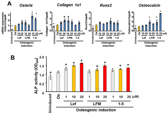 Effects of identified candidate compounds on the osteogenesis of MC3T3-E1 cells. MC3T3-E1 cells were cultured in a growth medium (Uninduced) or osteogenic induction medium (Os) with 1–25 μM leflunomide (Lef), LFM-A13 (LFM), and 1-(5-isoquinolinylsulfonil)-3-metylpiperazine dihydrochloride (1-5). (A) Expression of osteogenic marker genes, Osterix, Collagen 1a1, Runx2, and Osteocalcin was evaluated using a real-time RT-PCR analysis on day 10. Gapdh was used as the internal control. Experiments were performed in triplicate and repeated three times with similar results. Representative data from three independent experiments are shown (mean values ± standard deviation: n = 3). Significant differences (+ p < 0.05, * p < 0.01: ANOVA with Dunnett’s correction for multiple comparisons) were evaluated in comparison to the control (Os) values. (B) Colorimetric analysis of ALP activity assay using MC3T3-E1 cells on day 14. The data represent the mean values ± standard deviation (n = 4). Significant differences (+ p < 0.05, * p < 0.01: ANOVA with Dunnett’s correction for multiple comparisons) were evaluated in comparison to the control (Os) values.