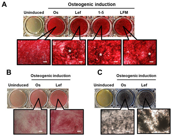 Effects of the identified candidate compounds on the osteogenesis of mouse and rat mesenchymal stem cells (mMSCs and rMSCs). mMSCs (A) and rMSCs (B,C) were cultured in a growth medium (Uninduced) or osteogenic induction medium (Os) with 10 μM leflunomide (Lef), LFM-A13 (LFM), and 1-(5-isoquinolinylsulfonil)-3-metylpiperazine dihydrochloride (1-5). (A) ALP/von Kossa staining was performed for mMSCs on day 14. Bars: 200 μM. Asterisks indicate von Kossa-positive nodule mineralization. (B) ALP or (C von Kossa staining was performed for rMSCs on days 14 and 21, respectively. Bars: 200 μM.