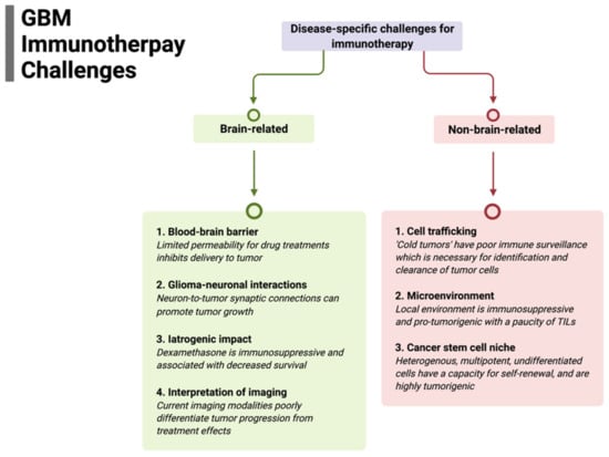 Summary of disease-specific challenges for glioblastoma immunotherapy divided by specific brain-related and non-brain-related challenges that need to be overcome for efficacy.