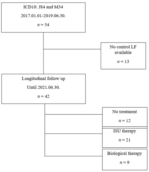 Our study is based on the retrospective data analysis of SSc-ILD outpatients classified under ICD10 J84 and M34 codes, who were presented at the Semmelweis University Pulmonology Department between January 2017 and June 2019. The diagnosis of SSc and treatment initiation was made by immunology and rheumatology specialists in immunological-rheumatological centers in central Hungary. The majority of patients had dcSSc (93%), while 4 patients had lcSSc, which had been known for more than 10 years in all cases. The dermatological care of patients with skin involvement took place in dermatology centers, and our study did not cover the exact assessment of these symptoms. All patients were evaluated by our MDT. A total of 54 SSc-ILD patients were identified and 42 of them had pulmonary follow-up in the given time interval and were included in the longitudinal evaluation. In accordance with the therapy, the patients were divided into 3 subgroups: no treatment (n = 12), immunosuppressive therapy (ISU, n = 21) and biological therapy (rituximab or tocilizumab) recipients (n = 9). The patient inclusion is summarized in Figure 1. The most frequently applied ISU therapies were CYC or MMF with or without low-dose glucocorticosteroids.