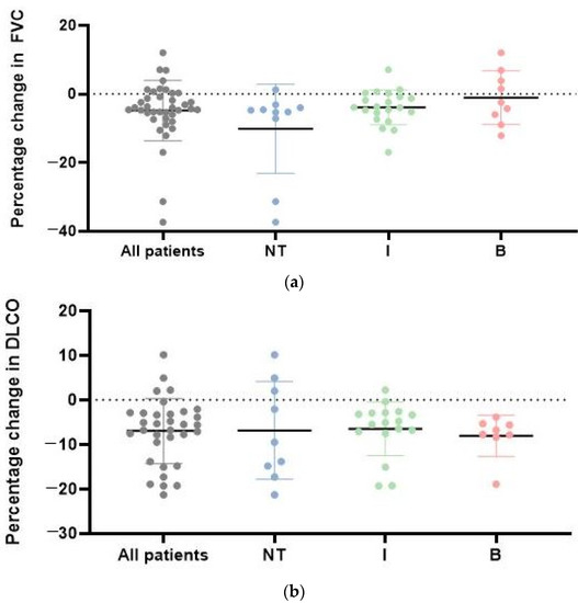 (a) Annual FVC changes in all SSc-ILD patients and in the specific treatment groups. Description of what is contained in the first panel; (b) annual DLCO changes in each specific treatment group; DLCO, diffusing capacity for carbon monoxide; FVC, forced vital capacity; I = ISU therapy; NT = No treatment; I = ISU therapy, B = Biological therapy.