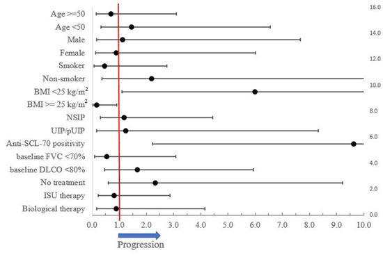 Statistical analysis was performed using Graph Pad software (GraphPad Prism 5.0 Software, Inc., La Jolla, CA, USA) and Microsoft Excel (Microsoft Corporation, Redmond, DC, USA). Continuous variables were expressed as the mean ± standard deviation. The Kolmogorov–Smirnow test was used for the normality test of data. Differences between the groups for continuous data were evaluated in normally distributed data with a Student′s t-test. Otherwise the Mann–Whitney U test was used. Analysis of variance (ANOVA) and Tukey’s post hoc analysis were used to examine the continuous variables in the therapeutic subgroups. The chi-squared test and two-tailed Fisher’s exact test were applied for comparing the categorical variables. Predictors of the progression were analyzed using the odds ratio and plot analysis. The correlation between the BMI and FVC was analyzed by logarithmic transformation. All % values are expressed for the whole study population (all patients) or respective subgroups as indicated. A p-value < 0.05 was defined as statistically significant.