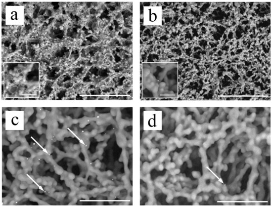 SEM visualization of Au/Pt particles on cellulose: (a,b) Representative SEM images of cellulose before (a) and after (b) NanoSuit treatment. Scale bar: 40 μm. The inset is the magnified image. Scale bar: 4 μm. (c,d) SEM images of the “positive visual detection” test line and background area, respectively, of the LFA kit. Representative Au/Pt particles are indicated with white arrows. Scale bar: 10 μm.