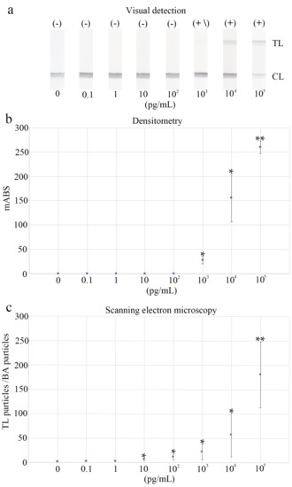 Visual observation, densitometry, and scanning electron microscopy (SEM) were used to compare the performance of the lateral flow assay (LFA): (a) Visual detection of a diluted series of SARS-CoV-2 nucleocapsid protein samples. (+) represents positive, (+\) represents positive to undetermined, (-) represents negative. (b) Densitometry and (c) SEM detection using the same dilution series of SARS-CoV-2 nucleocapsid protein samples as in (a). * p < 0.05, ** p < 0.01. TL, test line; CL, control line; mABS, milli-absorbance units; BA, background area.