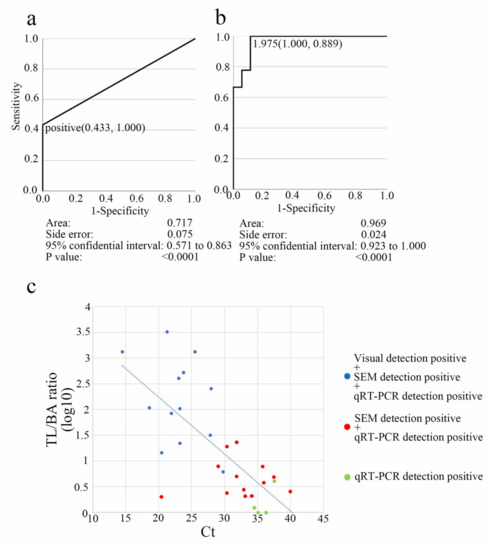 For the differential diagnosis of SARS-CoV-2, clinical nasopharyngeal swab samples (n = 45) were examined using LFA and qRT-PCR. We detected 30 positive and 15 negative SARS-CoV-2 cases using qRT-PCR. The sensitivity and specificity of visual and SEM detection of LFA were then compared with those of qRT-PCR. The ROC curve was used to estimate the diagnostic cut-off value. The area under the curve (AUC) value for visual diagnosis was 0.717 (95% CI: 57.1–86.3%; p < 0.0001), with a specificity of 0.433 and a sensitivity of 1.000 (Figure 4a; Table S3). The TL/BA ratio of SEM detection was evaluated using the ROC curve. With a specificity of 1.000 and a sensitivity of 0.899, the AUC value for the SEM-based TL/BA ratio diagnosis was 0.969 (95% CI: 92.3–100%; p < 0.0001), with a cut-off value of 1.975 (Figure 4b). This is comparable with previous cut-off values (2.023) for the dilution assay (Figure 3c; Table S2). According to the observational data and statistical analysis, if there was more than one particle on an average in a single visual field (1200×), and the average ratio of TL/BA was >2, the result was considered positive. In Figure 4c, scatter plots depict the quantitative association between the TL/BA ratio (log10) and Ct values (Table S3). Because the correlation coefficient between Ct and particle counts/field was −0.427 and statistically significant (p = 0.00866), the null hypothesis was rejected.