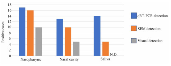 Comparison of detection methods among different sample types. Samples of the nasopharynx, nasal cavity, and saliva collected from the same person were compared using visual, scanning electron microscopy, and qRT-PCR detection methods. N.D. represents “not detected”.