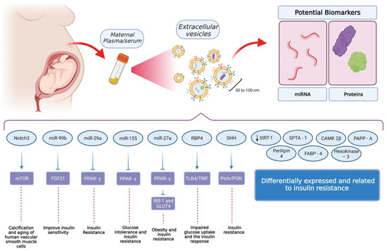 Levels of Sonic Hedgehog (Shh) within circulating EVs are higher in patients with type 2 diabetes (DT2) compared to controls without DT2. Interestingly, EVs are released in response to high glucose and insulin from adipocytes and induced pro-inflammatory state of bone marrow-derived macrophages (BMDM) and RAW 264.7 macrophages. This mechanism seems to be mediated through Ptch/PI3K signalling pathway and contributes to insulin resistance in adipocytes [85]. Bioinformatic analysis and posterior validation with Western blot and real-time qPCR of human umbilical vein endothelial cells (HUVECs) obtained from GDM patients showed that Shh and the transcription factor E2F1 were significantly downregulated in cases of GDM compared with non-GDM; whereas Homeobox A9 (HOXA9) and Signal Transducer And Activator Of Transcription 1 (STAT1) were upregulated [86]. Absence of Sirtuin-1 (SIRT1) in adipocytes in vivo, a key sensor and regulator of lipid metabolism, increases the body weight and fat mass in mice. SIRT1-deficient mice demonstrate increased release of EVs from adipose tissue with a potential systemic effect on metabolic regulation [87] leading to impaired glucose tolerance and insulin sensitivity. It has been determined that GDM patients show differences in the expression of other proteins such as spectrin alpha erythrocytic (SPTA)-1, CAMK 2β, PAPP-A, Perilipin 4, fatty acid-binding protein (FABP) 4 and hexokinase-3 [17], and all proteins were previously shown to also be differentially expressed and related to insulin resistance [88,89,90]. Taken globally, these data suggest that EVs are involved in changes in insulin sensitivity by transferring bioactive molecules to target cells that might lead to GDM.