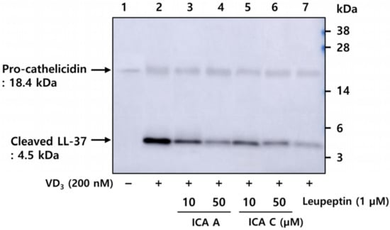 To investigate the inhibitory effects of isochlorogenic acids A and C on the activation of cathelicidin into LL-37 induced by VD3, HEKn were pretreated with these compounds, followed by incubation with VD3 for 48 h. Activated LL-37 was analyzed via western blot in HEKn culture medium. The results suggested that pro-cathelicidin was hardly induced in the vehicle-treated condition, whereas cathelicidin and activated LL-37 were both detected following VD3 treatment (Figure 3). Pro-cathelicidin was cleaved into LL-37 by activated KLK5, indicating that proteolytic cleavage was inhibited by isochlorogenic acids A and C, and leupeptin, a specific serine protease inhibitor (Figure 3). These results indicate that isochlorogenic acids A and C inhibited the activation of the precursor cathelicidin secreted by HEKn into LL-37, a biologically active form by regulating the proteolytic activity of KLK5.