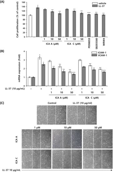 Chlorogenic acid isomers inhibit vascular endothelial cell activation. HMEC-1 was pretreated with isochlorogenic acids A, isochlorogenic acid C, 20 µM ERK1/2 inhibitor, 10 µM p38MAPK inhibitor, and 10 µM FPRL1 antagonist for 1 h, and subsequently treated with 5 µg/mL LL-37. (A) Cell proliferation was measured using the WST1 assay. (B) The expression of cell adhesion molecules, ICAM-1 and VCAM-1 mRNA was measured by quantitative real-time PCR. (C) Cell migration was measured using scratch migration assay. Representative image of the inhibition of cell migration by isochlorogenic acids and C, compared with vehicle-treated control; scale bars are 100 µm. The results are expressed as mean ± standard deviation (SD) (n = 3). * p < 0.01 vs. vehicle control; ** p < 0.05 vs. LL-37-treated control; *** p < 0.01 vs. LL-37-treated control. ICA A, isochlorogenic acid A; ICA C, isochlorogenic acid C.
