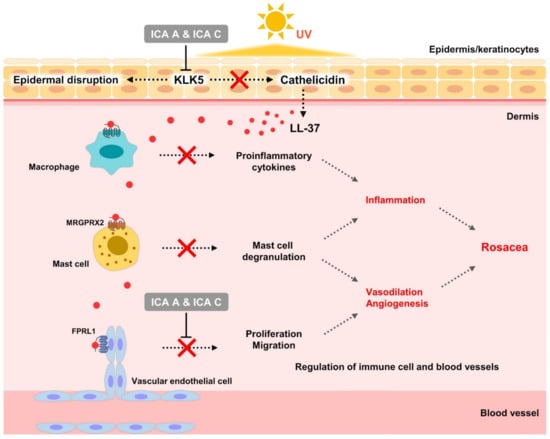 Mast cells are found at the boundary between organs, tissues, and external environments such as skin, gastrointestinal tract, and epithelium, and differ in inflammatory response and release of inflammatory mediators depending on the tissue or organ location [,]. Mast cells are activated by other immune cells, including macrophages, neutrophils, and T cells, and are involved in the pathogenesis of rosacea via release of preformed inflammatory mediators such as pro-inflammatory cytokines, chemokines and proteases that induce skin inflammation [,,]. Recently, mast cells have emerged as a key factor in LL-37-induced rosacea [,]. Therefore, the inflammation in rosacea can be modulated by inhibiting the generation of LL-37 via inhibition of KLK5 activity, or by directly blocking the release of inflammatory mediators induced by LL-37 in mast cells.