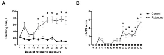 Changes in motor symptoms during 32 days of daily rotenone injections (A) Increase in climbing time in the gridtest depending on the day of rotenone cumulative action. (B) Modified Neurological Severity Score (mNSS) results depending on the day of rotenone cumulative action. * p < 0.05 compared to the control group at the same time point.