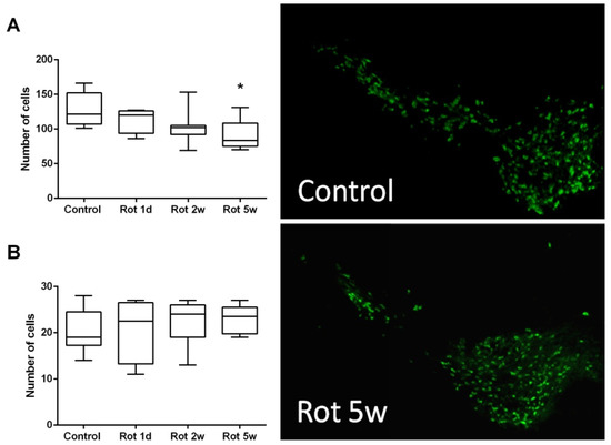 The number of TH-positive cells in SNpc decreased slightly over the course of the experiment in rotenone-treated animals, which was confirmed by ANOVA test for a linear trend (F(1, 21) = 8.9, p < 0.05). However, pairwise comparison of the groups showed a significant difference from control groups only in the “Rot 5 w” experimental group (Figure 3A). The decrease in the number of cells in SNpc progressed slowly and by the 5th week, the mean number of cells in rotenone-treated animals constituted 72 ± 7% of control group values, p < 0.05. At the same time, we were unable to show any significant changes (Figure 3B) in the number of TH-positive cells in the VTA area (F(3, 21) = 0.41, p = 0.75).