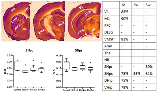 The results of the comprehensive analysis of the COX activity in different areas of the mouse’s brain are summarized in the Figure 4. The analysis showed that the main differences in the COX activity are pronounced after the first day of rotenone injections. The table shows that the main regions with significantly decreased activity were SNpc, VMStr and cortical structures—V1, M1, DHip and VHip. The most affected regions were hippocampus and SNpc, showing a decrease from the control group by 25% (Figure 4). Following the course of chronic rotenone injections these acute changes of COX activity normalized and no significant differences in optical density were found in most of the areas after both the 2nd and 5th weeks. However, COX activity in substantia nigra showed a different picture—a significant decrease of COX activity in SNpc was shown in all experimental groups and in SNpr, a significant decrease was present only by the 5th week of experiment.