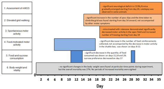 The major findings of this study include the behavioral staging of the rotenone-induced pathology in C57BL/6 mice (Figure 5) and evaluation of key pathological cascades, corresponding to these stages: SNpc neurodegeneration, lipid peroxidation and regional energy metabolism changes in the brain.
