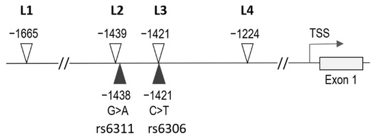 Schematic representation of the HTR2A promoter region. Positions of the analyzed methylation sites (L1, L2, L3, L4) are indicated by open triangles and those of the analyzed polymorphic sites (rs6311, rs6306) by closed triangles. Numbers refer to positions in bp relative to the ATG start codon in exon 1. The arrow indicates the major transcription start site (TSS).