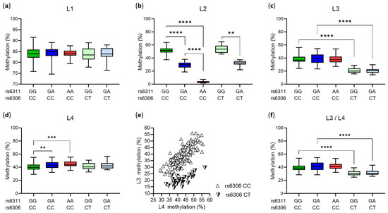 Methylation levels at L3 and L4 sites were highly correlated (Figure 2e). As the average methylation of these two sites (L3/L4 methylation) was associated with neonatal behavioral parameters in another study [50], we considered L3/L4 methylation in further analyses. L3/L4 methylation varied depending on the rs6306 genotype but not on the rs6311 genotype (Figure 2f).
