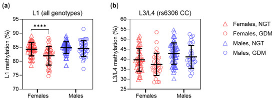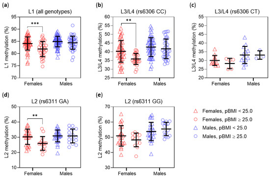 The mean methylation of L3 (−1421) and L4 (−1224) sites (L3/L4 methylation) in placentas from our study sample (39.1 ± 6.7%, n = 196 including the single rs6306 TT genotype) was comparable to that reported for term placentas in a sample of Caucasian and non-Caucasian participants (37.1 ± 8.8%, n = 444) [50]. Similar to L1 methylation, L3/L4 methylation was negatively associated with maternal pBMI in female placentas but not in male placentas (Figure 3b and Table 3). Regarding the effect of GTS on L3/L4 methylation, a statistically significant main effect of GTS on L3/L4 methylation was found by two-way ANOVA (Figure 4b), but GTS was not a statistically significant predictor of L3/L4 methylation in multiple regression analyses in female or male samples (Table 3), possibly because of insufficient statistical power.