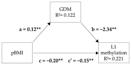 Because both pBMI and GDM were significant predictors of L1 methylation in female placentas, we performed a mediation analysis in which we tested whether GDM was a mediator between pBMI and L1 methylation (Figure 5). The analysis showed that higher pBMI was associated with lower L1 methylation (path c) and a higher probability of GDM (path a), which in turn was associated with lower L1 methylation (path b). Together, pBMI and GDM explained more variance in L1 methylation (22.1%) than pBMI (14.1%) or GDM (14.7%) alone, implying that pBMI and GDM each contributed independently to L1 variance, with GDM acting as a partial mediator between pBMI and L1 methylation levels in female placentas.