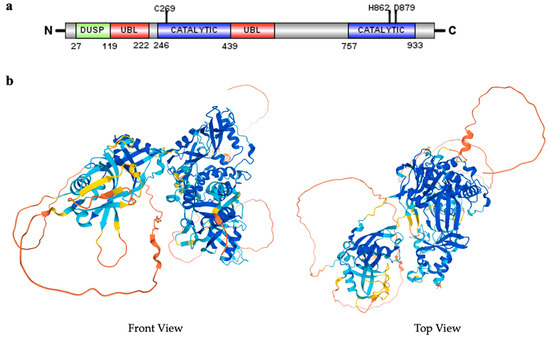 - Elliott, P.R.; Liu, H.; Pastok, M.W.; Grossmann, G.J.; Rigden, D.J.; Clague, M.J.; Urbé, S.; Barsukov, I.L. Structural variability of the ubiquitin specific protease DUSP-UBL double domains. FEBS Lett. 2011, 585, 3385–3390. [Google Scholar] [CrossRef] [PubMed]
