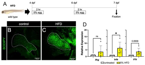 First, to produce a state of overnutrition in our model, we used a high-fat feeding paradigm (depicted in Figure 1A) wherein zebrafish larvae were immersed in a 5% homogenized chicken egg solution for 2 h, at both 4 days post-fertilization (dpf) and 6 dpf. This high-fat diet (HFD) treatment of larvae resulted in fat accumulation in the liver, as revealed by BODIPY labeling of lipid droplets in hepatocytes (Figure 1B,C). To determine if an inflammatory state was promoted, we measured the expression of the zebrafish orthologues of the pro-inflammatory cytokines IFNγ (ifng), TNFα (tnfa), and IL-1β (il1b) using quantitative PCR (qPCR) of whole embryo cDNA preparations and found a mild but statistically significant increase in tnfa only (Figure 1D). These results indicate that dietary lipids are being consumed by the larvae, that these are processed and trafficked to the hepatocytes, and this may induce a mildly inflamed state.