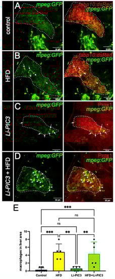 NAFLD progression is characterized by the infiltration of macrophages [25]. To study the phenotype of macrophage infiltration in our NAFLD model, we bred the Tg(mpeg:GFP) allele into our Li-PIC3 transgenic fish to mark macrophages with green fluorescence. Whereas macrophages were rarely observed within the liver boundaries at 7 dpf under control conditions (Figure 3A), they were often observed in the livers of HFD, Li-PIC3, and Li-PIC3+HFD larvae (Figure 3B–D). When infiltrating macrophages were quantified, we calculated a statistically significant elevation in hepatic macrophage infiltration for HFD and Li-PIC3+HFD larvae relative to controls (Figure 3E).