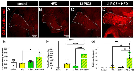 To assess reactive oxygen species (ROS)-mediated stress in the liver, which is a common feature of NAFLD, cohorts of HFD-fed, Li-PIC3, and Li-PIC3+HFD larvae, and controls were each stained with CellRox Deep Red, an indicator of ROS (Figure 4A–D). When the intensity of CellRox staining was quantified, we detected no increase with either of the single treatments, HFD or Li-PIC3 (Figure 4E). However, we detected nearly a 2-fold increase in ROS under the combined Li-PIC3+HFD experimental conditions. Next, in humans with liver damage, gamma-glutamyl transferase (GGT) and lactate dehydrogenase (LDH) proteins are released into circulation [26,27], and their levels may be used as a diagnostic benchmark for determining the extent of the injury. Accordingly, we reasoned that ggt and ldh1a mRNA expression levels would be correspondingly elevated in the hepatocytes of damaged livers, mirroring their corresponding elevated serum protein levels; this would permit measurement of ggt and ldh1a in zebrafish larvae as a surrogate approach to quantifying the extent of hepatocyte injury where it is not possible to assay serum. Thus, we measured the mRNA expression levels of ldh1a and ggt using qPCR. (Figure 4F,G). Whereas larvae subjected to each of the single experimental stresses showed no significant evidence of liver injury, those in the combined Li-PIC3+HFD condition showed striking elevations of ggt (>50-fold) and ldh1a (>230-fold).