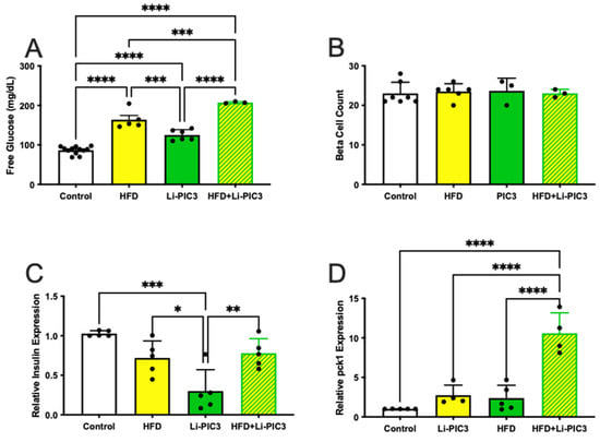In humans, NAFLD is strongly associated with insulin resistance, obesity, and type 2 diabetes [28]. We hypothesize that treatment with HFD, Li-PIC3, and their combination is associated with increasing levels of pancreatic β cell dysfunction/insufficiency as reflected by increasing systemic glucose levels. To measure glucose levels in zebrafish larvae, cohorts of like-treated larvae were pooled and homogenized, and free glucose levels were measured via colorimetric assay as previously described [22]. We found that glucose was elevated relative to controls under all conditions tested (Figure 5A), though the highest levels were measured in larvae subjected to the Li-PIC3+HFD combined treatment. To determine if this relative deficit in β cell function was related to a change in the absolute quantity of β cells, we counted β cells using confocal microscopy. No differences were observed among any of the treatments (Figure 5B). Next, we measured the expression of mRNA to determine if insulin levels produced by the β cells were responsible for the change in glucose levels. We found small but significant variation in insulin expression, with the lowest levels in the single Li-PIC3 larvae (Figure 5C). Lastly, we measured the expression of phosphoenolpyruvate carboxykinase (pck1) in zebrafish as a measure of insulin signaling; pck1 is expressed in the liver, where it catalyzes the first committed step in gluconeogenesis, and its expression is suppressed by insulin. We found that pck1 levels remained unchanged with the single perturbations of HFD and Li-PIC3 but were elevated nearly 10-fold with the combination Li-PIC3+HFD treatment (Figure 5D).