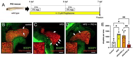 Pioglitazone treatment reduces lipid droplet accumulation in the liver. (A) Experimental scheme of PIO treatment. Larvae were immersed in PIO+ 0.1% DMSO for 1 h prior to the first HFD treatment and remained in PIO throughout. (B–D) Representative optical slices of BODIPY-stained 2CLIP zebrafish liver depicting (B) untreated controls, (C) HFD-fed larvae, and (D) HFD-fed + PIO hi (5 µM) treated larvae; hepatocytes are labeled in red via expression of the transgene fabp10:dsRed and examples of green-labeled lipid droplets are indicated by arrows. (E) Quantification of lipid droplets in hepatocytes area as executed with FIJI software. Statistical analysis was by one-way ANOVA; * p < 0.05, ** p < 0.01. Scale bar = 50 µm.