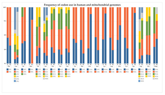 Frequency of codon use in human nuclear and mitochondrial genomes. Left column: nuclear codon usage; right column: mitochondrial codon usage for respective amino acids.