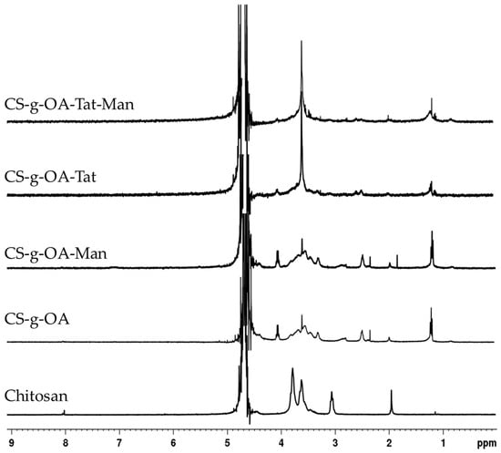 The 1H-NMR spectra of CS and synthesized OA-g-CS, OA-g-CS-Man, OA-g-CS-Tat, and OA-g-CS-Man-Tat conjugates.