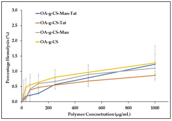 It was necessary to evaluate the blood compatibility of the synthesized polymers. The hemolysis, caused by OA-g-CS, OA-g-CS-Man, OA-g-CS-Tat, and OA-g-CS-Man-Tat, was determined by measuring the hemoglobin released by erythrocytes upon exposure to the different formulations. As seen in Figure 5, hemolytic activity remained below 2%, which suggests that polymers did not harm the erythrocytes. Moreover, Figure 6 visually corroborates the observed outcomes in Figure 5; erythrocytes treated with PBS were similar in appearance to cells treated with formulations at different concentrations.