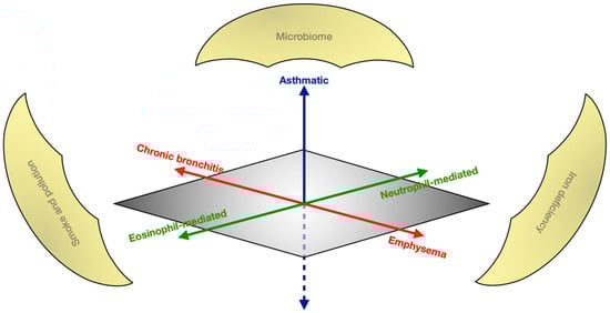 The heterogeneous spectrum of COPD. The x-axis (red) demonstrates the radiological dichotomy of characterising syndromes in COPD; the y-axis (blue) represents the nosological complexity of COPD’s physiologic overlap with asthma; and the z-axis (green) shows the cellular mediation driving the disease. Overarching environmental factors (gold) perpetuate the disease.