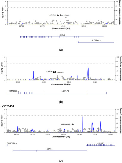 | rs11742635–FBN2 | GG | 59 (73%) | 98 (73.1%) | 0.609 |