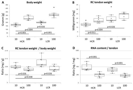 Body weight [g] (A), weight of the RC tendon [mg] (B), ratio of the RC tendon weight to body weight [mg/g] (C), and RNA content per tendon [ng/mg] (D) from HCR-10, HCR-100, LCR-10 and LCR-100. Significant differences (analyzed using the Kruskal–Wallis test followed by the Mann–Whitney U-test) are marked and the p-value displayed above. n = 7 per group.