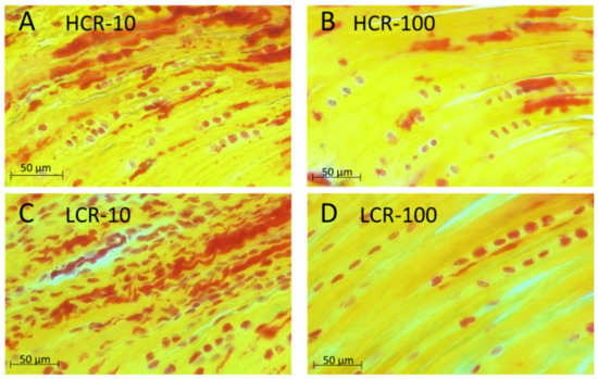 Histological staining of supraspinatus tendons of HCR-10 (A), HCR-100 (B), LCR-10 (C) and LCR-100 (D) using Movat Pentachrome (MP) staining. The number of elastic fibers and the wavy structure of the tendons of the young rats were reduced in the old tendons. Cell nuclei were stained in red; collagen in yellow and elastic fibers in red. Scale bar: 50 µm. The bone would be on the left side and the muscle on the right side of the tendon samples shown.