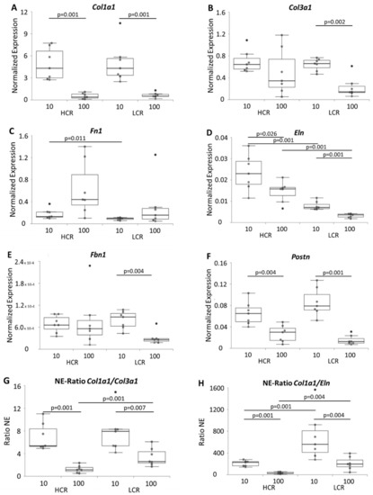 mRNA expression of ECM markers Col1a1 (A), Col3a1 (B), Fn1 (C), Eln (D), Fbn1 (E) and Postn (F) and Ratio of the NE Col1a1:Col3a1 (G) as well as Col1a1:Eln (H) in HCR-10, HCR-100, LCR-10 and LCR-100. Results are normalized to 18S rRNA and are shown as individual dot plots. Significant differences (analyzed using the Kruskal–Wallis test followed by the Mann–Whitney U-test and Bonferroni–Holm correction) are marked and the p-value displayed above. n = 7 per group.