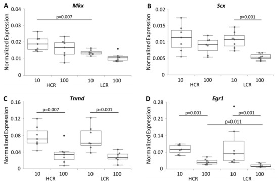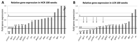 In HCR-10 vs. LCR-100, these six and a further nine genes (Col3a1, Fbn1, Scx, Mkx, Bmp1, Tgfb1, Dcn, Tnc, Esr1) were down-regulated. In addition, the repression of Col3a1, Eln, Fbn1, Egr1 and Tnc was very strong in LCR-100; by more than 60% in comparison to HCR-100.
