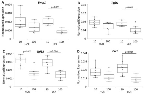 mRNA expression of the metalloprotease Bmp1 (A), the cytokines Tgfb1 (B), Tgfb3 (C) and the sex hormone receptor Esr1 (D). Results are normalized to 18S rRNA and are shown as individual dot plots. Significant differences (analyzed using the Kruskal–Wallis test followed by the Mann–Whitney U-test and Bonferroni–Holm correction) are marked and the p-value displayed above. n = 7 per group.