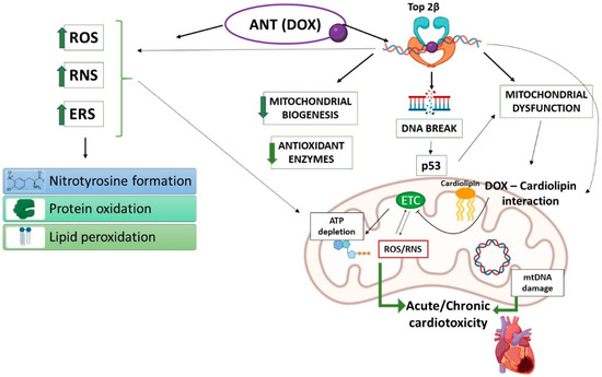 Schematic representation of major events leading to mitochondrial dysfunction during ANT (DOX)-induced cardiotoxicity. ANT: anthracycline; DOX: doxorubicin; ROS: reactive oxygen species; RNS: reactive nitrogen species; ERS: endoplasmic reticulum stress; Top2β: topoisomerase 2β; ETC: electron transport chain; mtDNA: mitochondrial DNA.