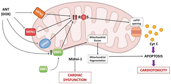 Schematic representation of mitochondrial dynamics alterations induced by ANT (DOX) leading to cardiotoxicity. ANT: anthracycline; DOX: doxorubicin; ROS: reactive oxygen species; MFN1: mitofusin-1; MFN2: mitofusin-2; OPA1: optic atrophy 1; DRP1: dynamin-related protein 1; Midivi-1: mitochondrial division inhibitor-1; mPTP: mitochondrial permeability transition pore; cyt c: cytochrome c.