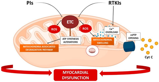 Proposed mechanism of cardiac mitochondrial alterations secondary to PIs and RTKIs exposure. PIs: Proteasome inhibitors; RTKIs: Receptor tyrosine kinase inhibitors; ETC: electron transport chain; ROS: reactive oxygen species; mPTP: mitochondrial permeability transition pore; cyt c: cytochrome c.