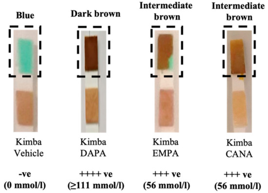 The non-diabetic Kimba mouse model does not normally excrete glucose in the urine. Therefore, in order to ascertain the bioactivity of the SGLT2 inhibitors, after 3 days of treatment, the urine of Kimba mice were tested (Figure 1) for glucosuria. As expected, treatment with all three inhibitors promoted glucosuria, with DAPA producing the most profound effect.