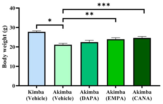 SGLT2 inhibition prevents failure to thrive phenotype in diabetic Akimba mice. Final body weight values are expressed as means + SEM; n = 3−18 mice/group. * p < 0.0001 (Kimba Vehicle vs. Akimba Vehicle); using One-way ANOVA ** p < 0.05 (Akimba EMPA vs. Vehicle); *** p < 0.01 (Akimba CANA vs. Vehicle). DAPA: Dapagliflozin; EMPA: Empagliflozin and CANA: Canagliflozin.