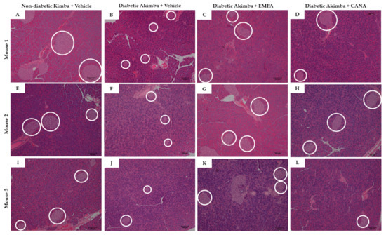 H&E staining of pancreatic tissue from Kimba mice treated with Vehicle (A,E,I) and Akimba mice treated with Vehicle (B,F,J), EMPA (C,G,K), and CANA (D,H,L). White circles indicate islets. Scale bar = 100 µm; Magnification = 100×. Three representative mice per treatment. H&E: Hematoxylin & eosin; EMPA: Empagliflozin; and CANA: Canagliflozin.