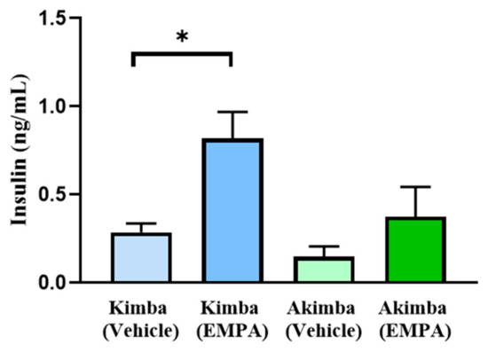 SGLT2 inhibition with EMPA increases circulating insulin levels in both Kimba and Akimba mice. Data represented as mean + SEM, n = 5–6 mice/group (Kimba), n = 3 mice/group (Akimba), using One-way ANOVA * p < 0.01 (Kimba Vehicle vs. Kimba EMPA). EMPA: Empagliflozin.