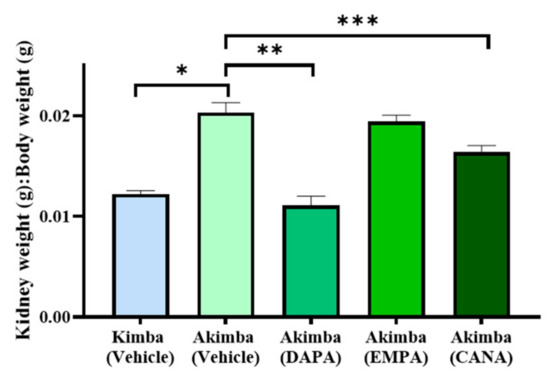 Effect of SGLT2 inhibition on kidney to body weight ratio (KW/BW) in diabetic Akimba mice. Data represented as mean + SEM, n = 3–18 mice/group. Using One-way ANOVA * p < 0.0001 (Kimba Vehicle vs. Akimba Vehicle); ** p ≤ 0.0001 (Akimba DAPA vs. Vehicle); *** p ≤ 0.006 (Akimba CANA vs. Vehicle). DAPA: Dapagliflozin; EMPA: Empagliflozin and CANA: Canagliflozin.